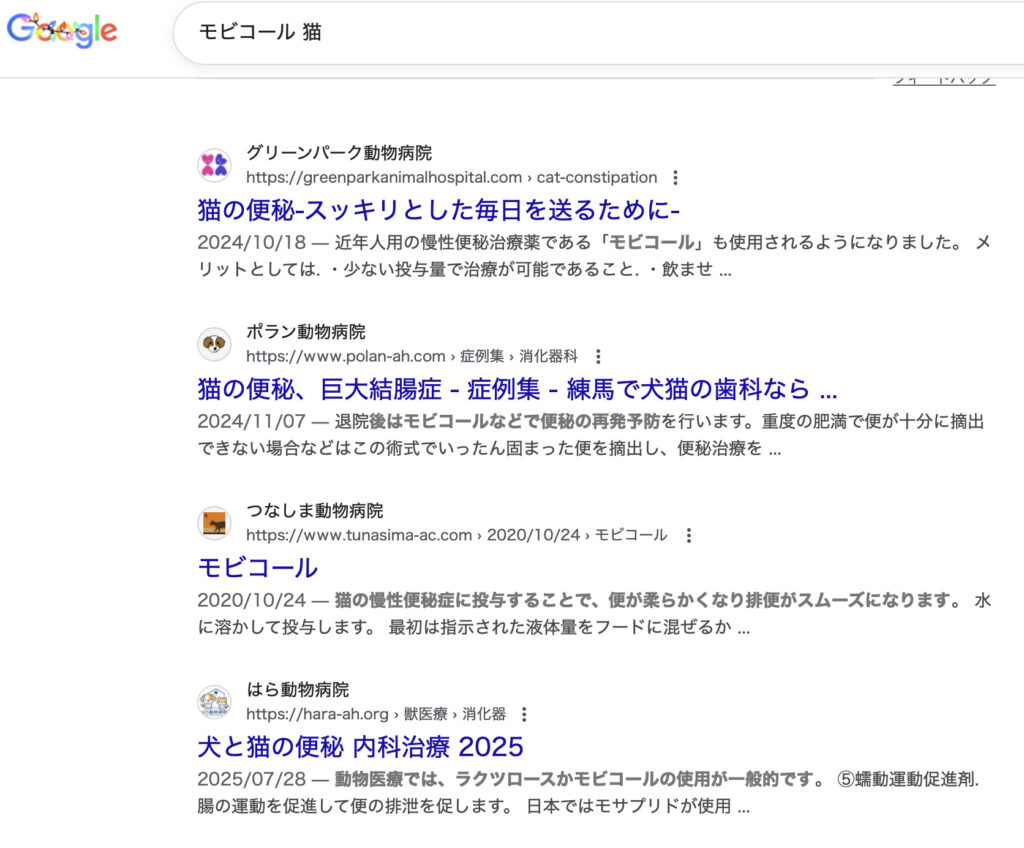 「モビコール 猫」で検索すると、ここ数年の記事がとってもたくさん出てきます。